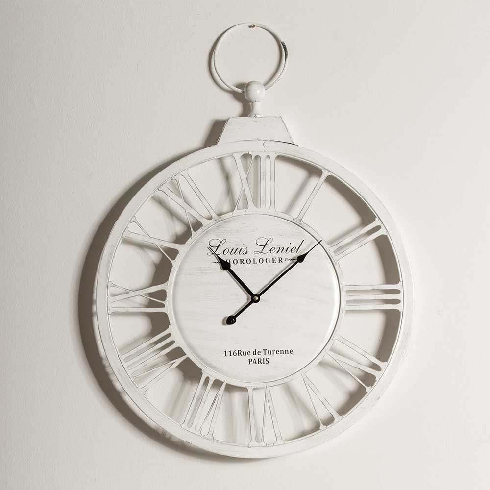 Das antikweiße Finish der Uhr wurde sorgfältig aufgetragen, um den authentischen Vintage-Look zu erzielen. Kleine Unregelmäßigkeiten und Abnutzungsspuren sind gewollt und unterstreichen den charmanten Charakter dieser einzigartigen Wanduhr. Sie erzählen von vergangenen Epochen und verleihen Ihrem Zuhause eine ganz besondere Persönlichkeit.