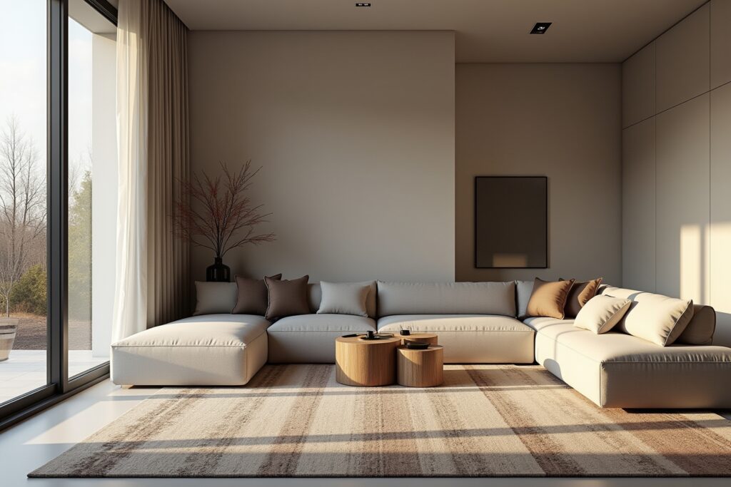 Dieses moderne Wohnzimmer beeindruckt mit 19 Teppichen. Eine einzigartige Bodengestaltung entsteht durch vielfältige Formen und Muster. Geschickt arrangiert, liegen einige übereinander, andere definieren Zonen. Dies verleiht dem Raum Tiefe und moderne Textur. Die Farbpalette ist zeitgemäß. Gemütlichkeit und Stil sind perfekt vereint, ein Blickfang.